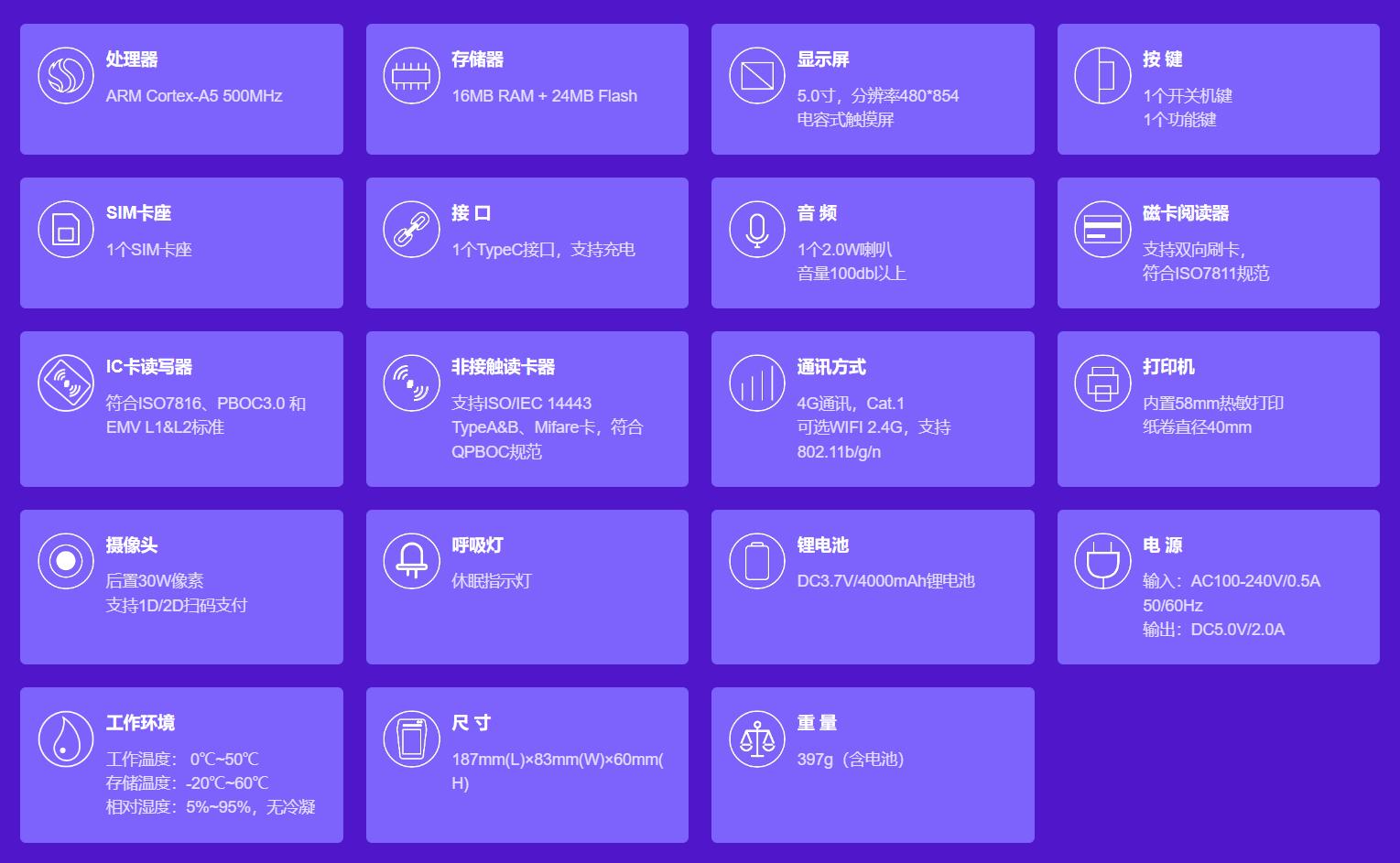 • 摄像头:后置30万摄像头 支持1D/2D扫码支付