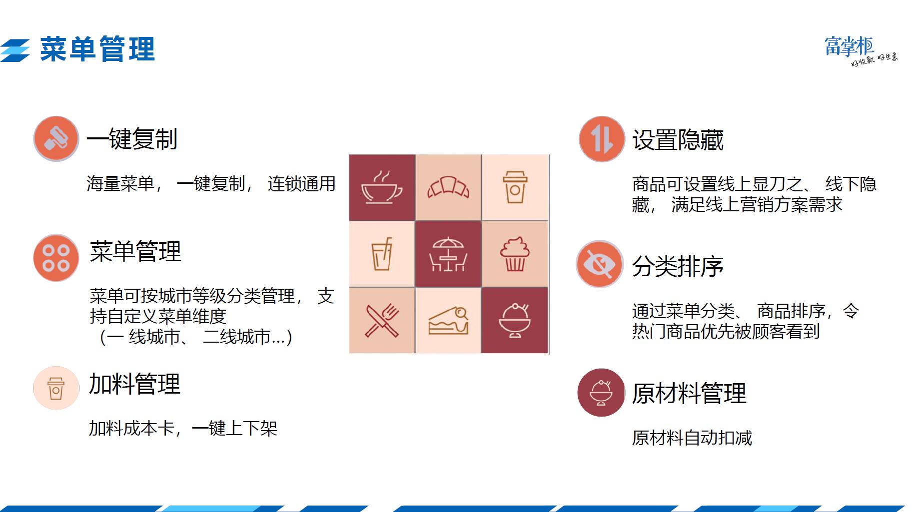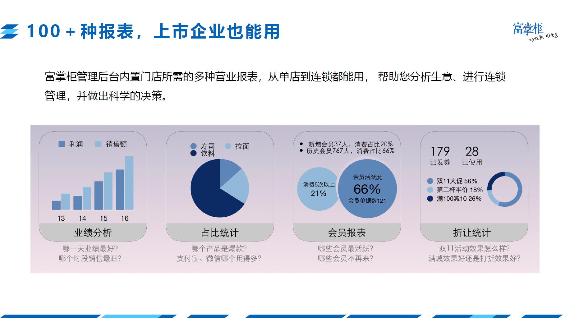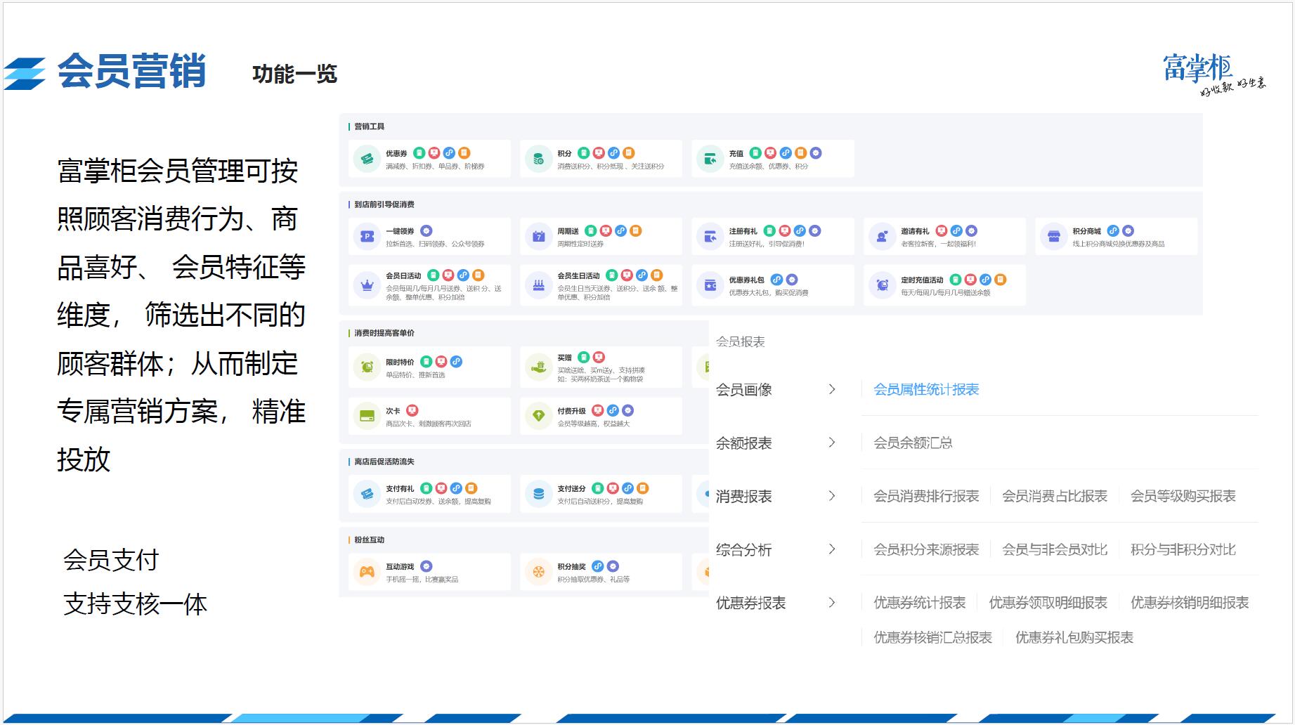 会员支付 支核一体 会员折扣 会员积分富掌柜会员管理可按照顾客消费行为、商品喜好、会员特征等维度, 筛选出不同的顾客群体;