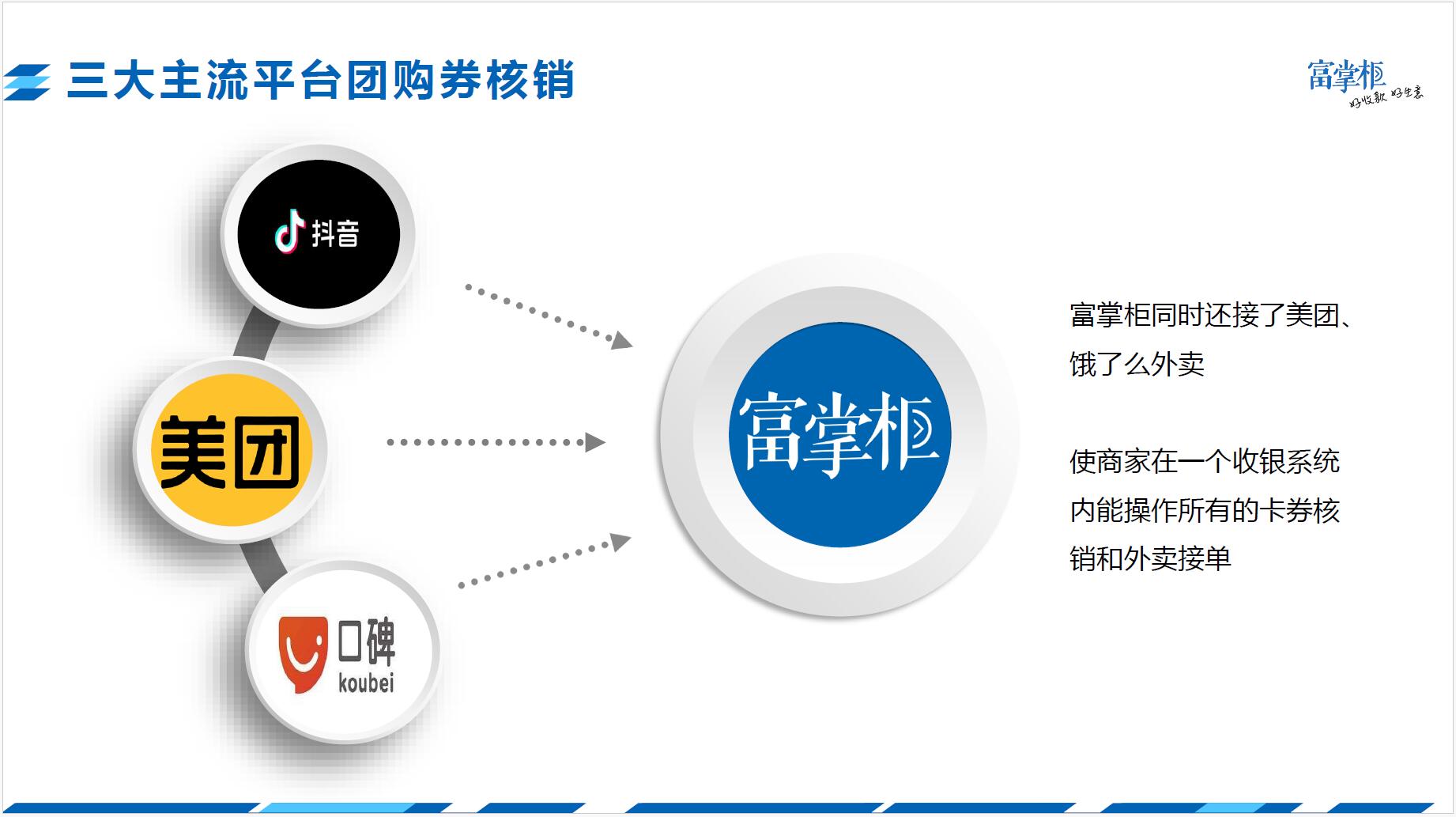 富掌柜同时还接了美团、饿了么外卖使商家在一个收银系统内能操作所有的卡券核销和外卖接单